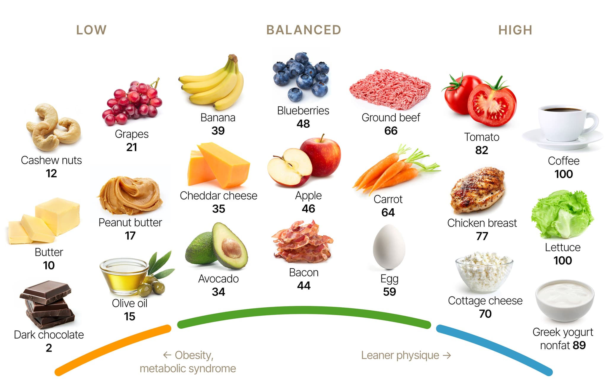 At the low end of the middle section, we find regular full-fat cheese, e.g. cheddar cheese (35). The more full-fat cheese you eat the more challenging it may be to lose weight. This is a common experience! Avocado is a surprise to many as it “only” scores 34. In modest amounts this is no big deal, but you may want to mix it up with higher-scoring foods.