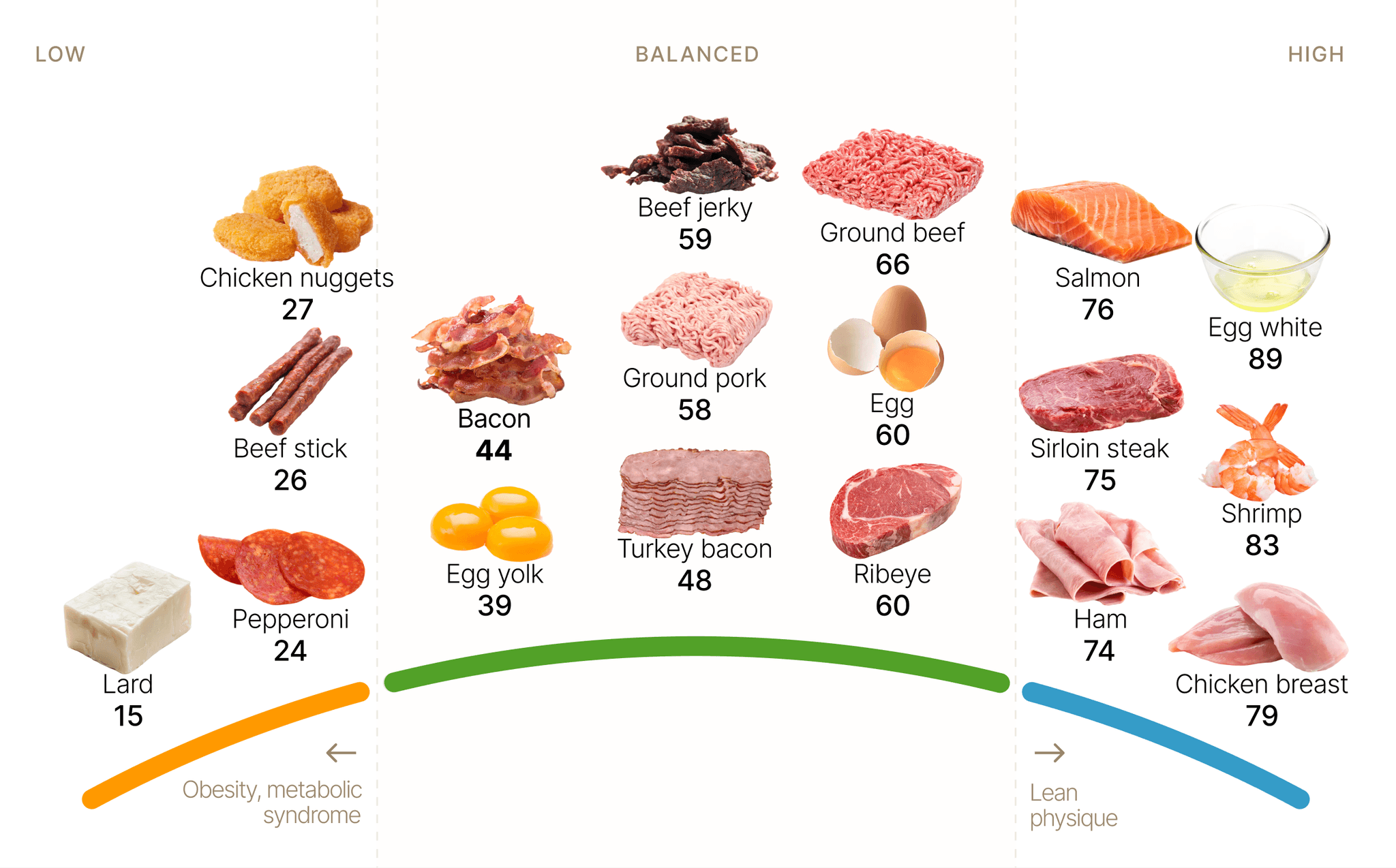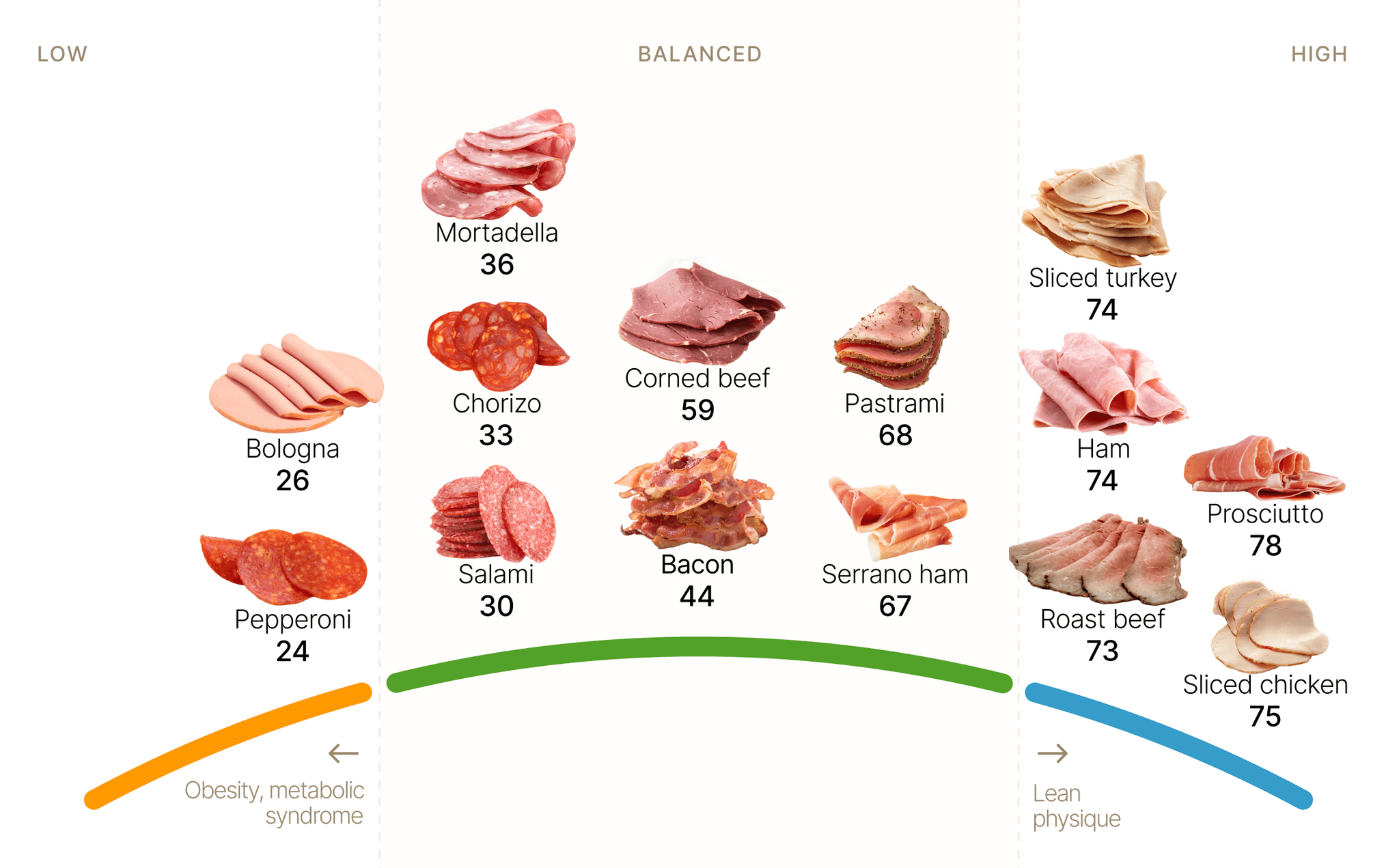 What does this mean? If you want to lose excess body fat or improve your metabolic health, go more for the higher-scoring deli meats, the ones to the right in the image.