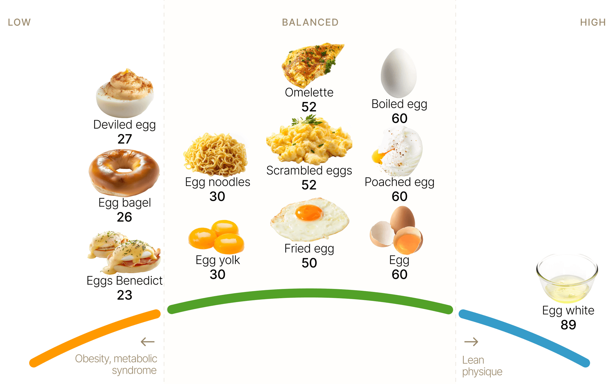 In general, eggs are very nutritious, and most score in the balanced satiety range, in the middle.