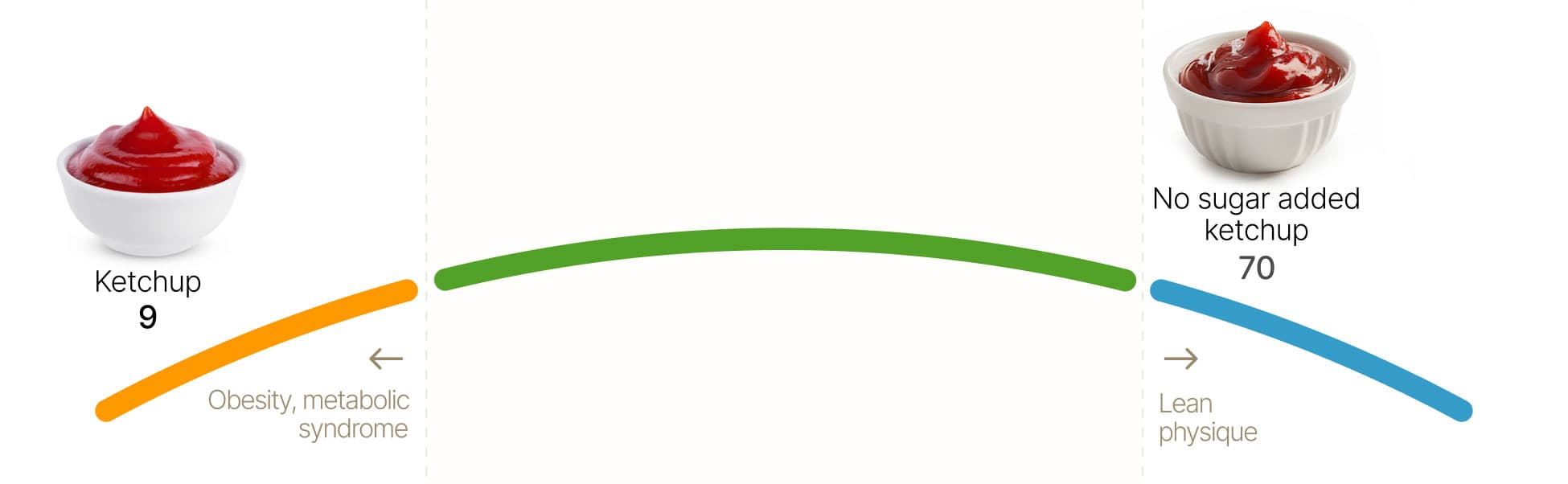 At the bottom, scoring in the low single digits, we find sugar-filled sauces like ketchup (9) and barbecue sauce (5). Note that sugar-free versions of these can score a lot higher. For example, no sugar added ketchup can score 70 or more (example).