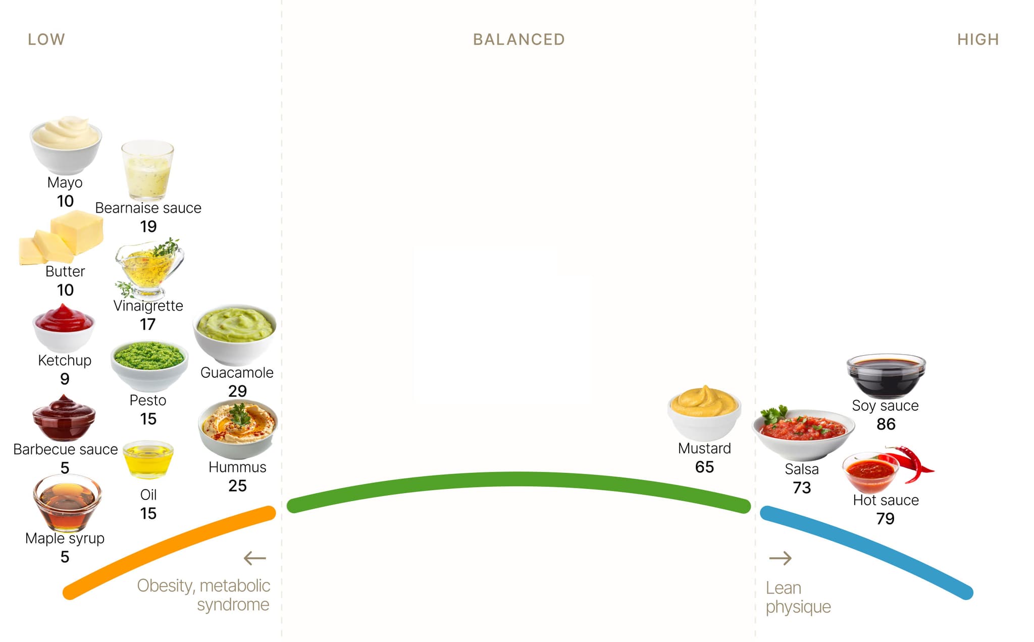 Here are satiety scores for common sauces and condiments. The scores range from 0 to 100 based on the food's overall protein percentage, energy density, fiber, and hedonic properties. This score predicts which foods cause you to eat more or less.