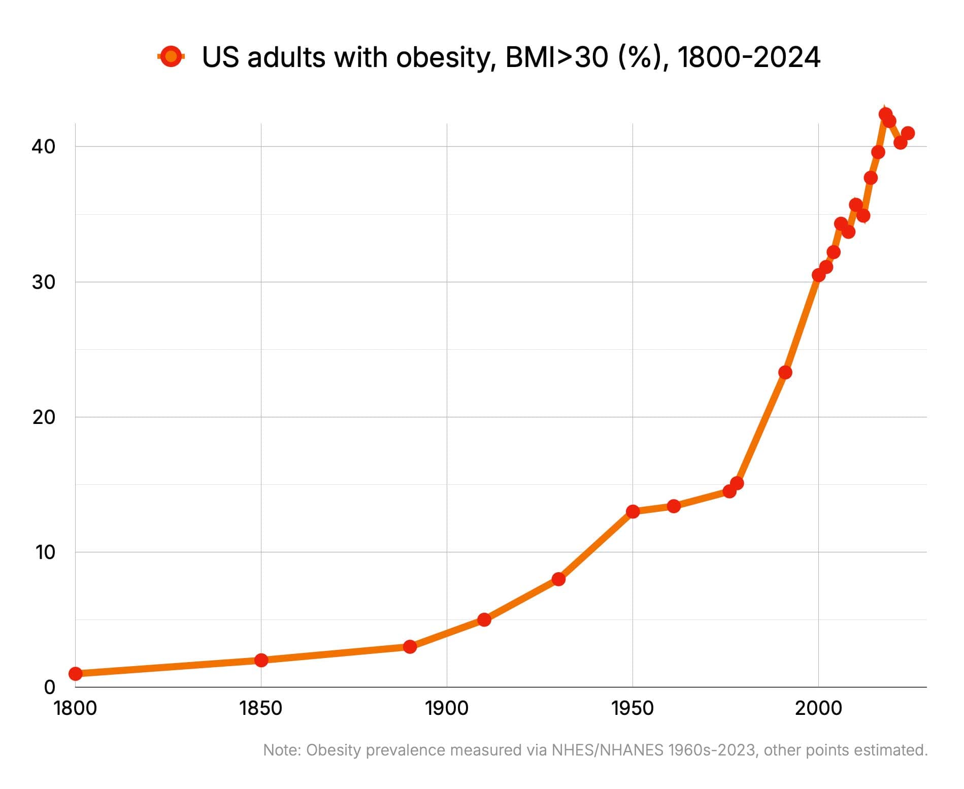 Obesity was still rare, perhaps only 1% of US adults, at the beginning of the 19th century. Previously, it had been virtually non-existent. Note that when examining hunter-gatherer tribes, humans living without access to modern foods, we find 0% obesity.